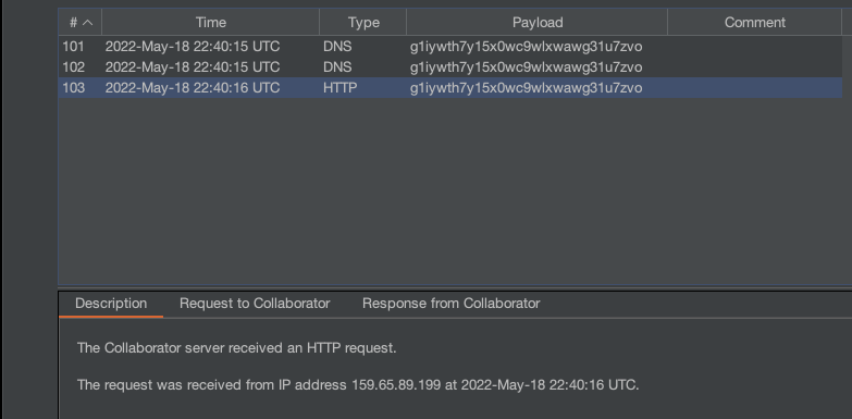 It takes a second, but once the text on the page changes to “Issue reported successfully!”, we received a request to our Burp Collaborator from the challenge’s IP address: